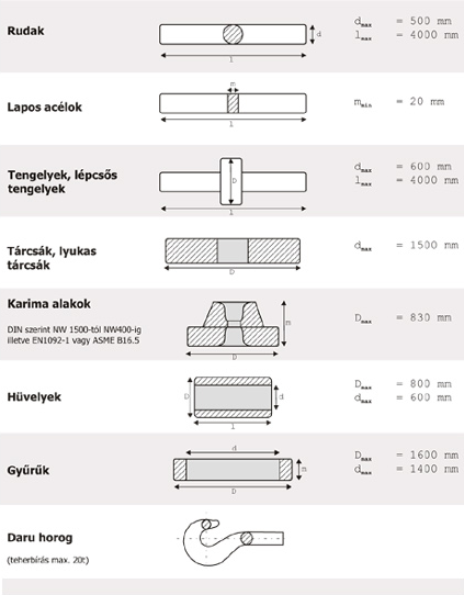 1-1800 kg/db tömegű szabadon kovácsolt és 20-80 kg/db tömegű süllyesztékben kovácsolt acélalkatrészek.
