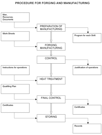 technology planning - chopping - heating - preforging - chopping - forging - heat treatment - mechanical testing - descaling - finish control - packaging.
